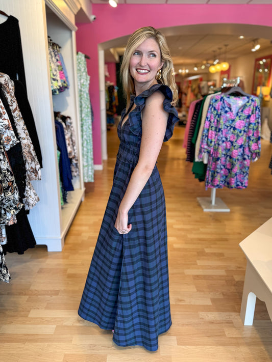 V-neck Flutter Sleeve Maxi Blackwatch Tartan