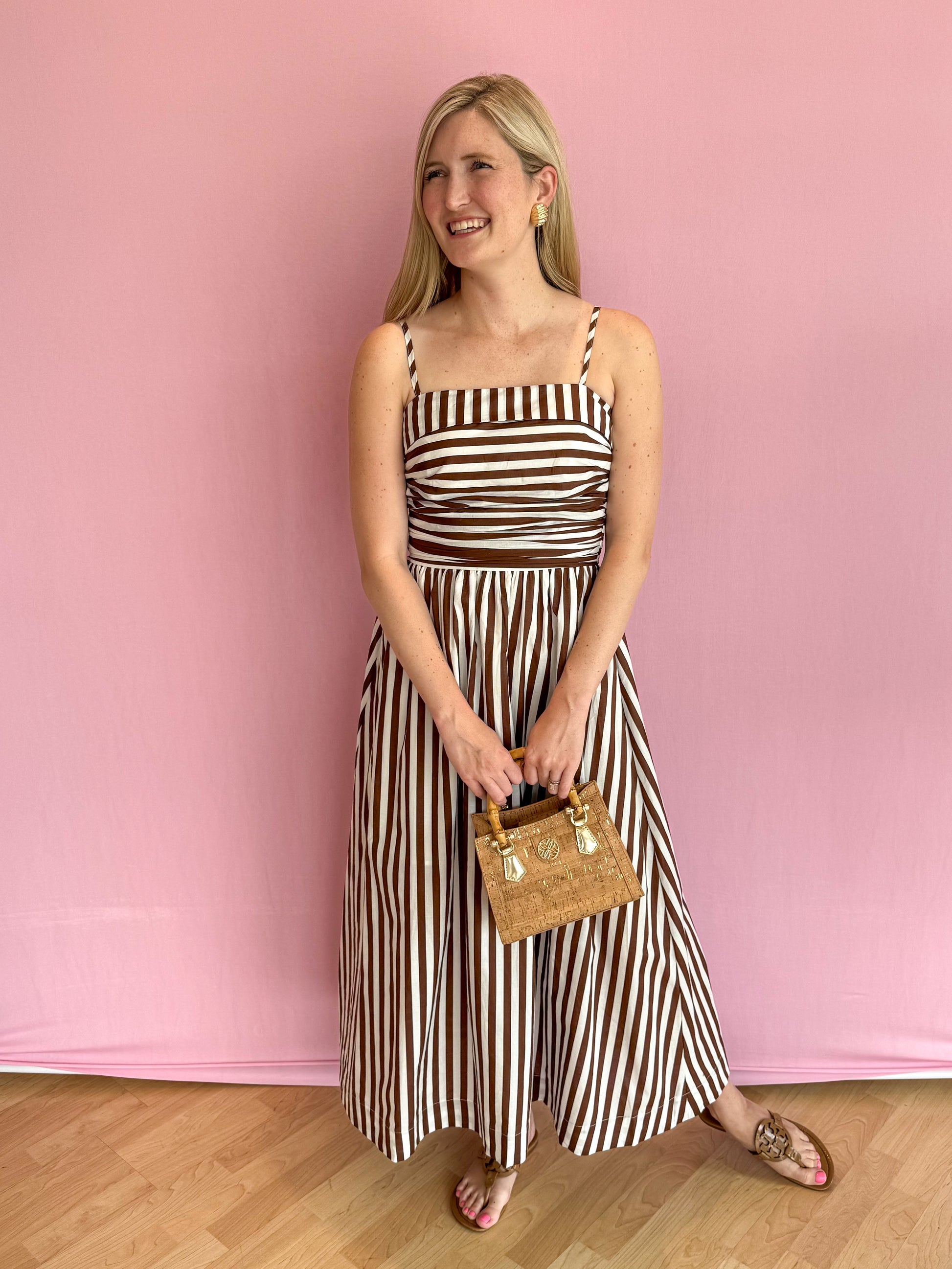 Whether you’re exploring local Tampa hotspots, enjoying a waterfront evening, or heading to a weekend getaway, the Brinkley Brown Striped Midi Dress brings you comfort, style, and that easy coastal elegance all in one.