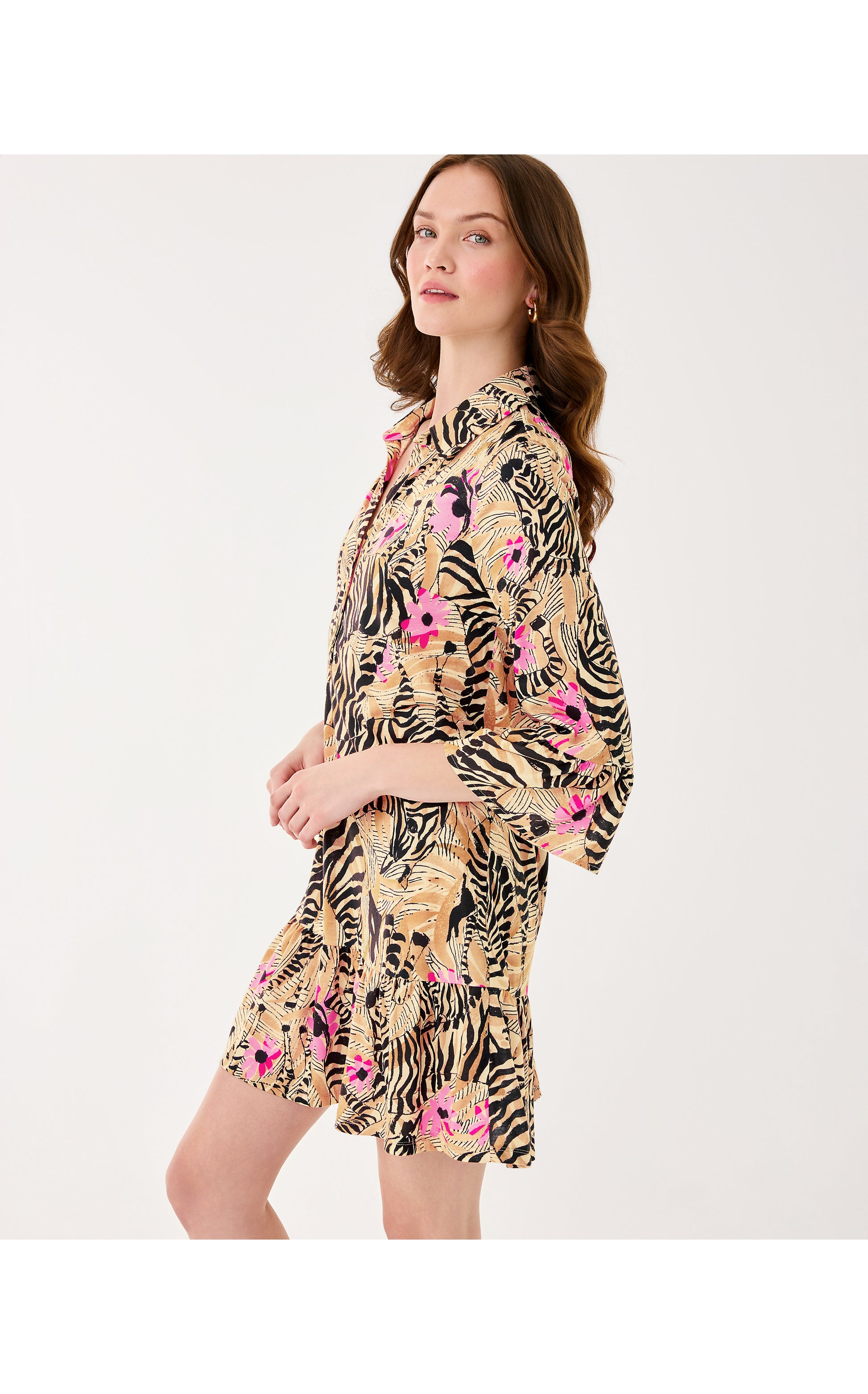 - Swing fit shirtdress with gold buttons, 3/4 length sleeves, and ruffle details.