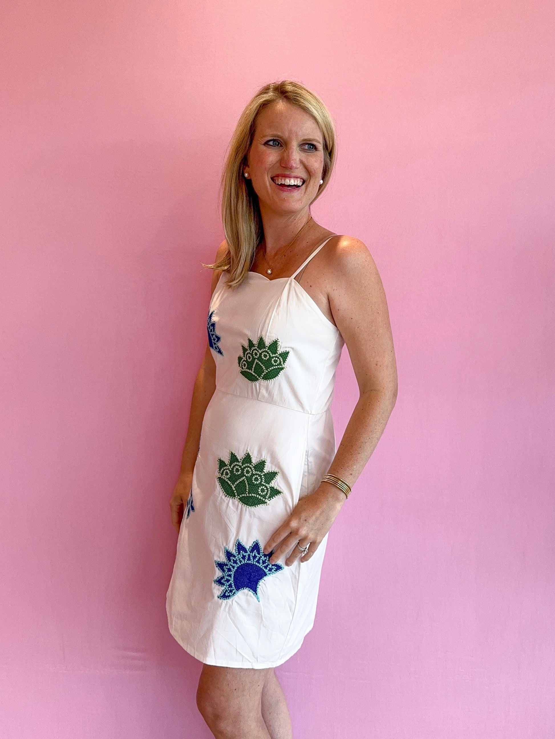 The Desert Sand Mini Dress is a fun twist on the a white mini dress. Colorful embroidery adds a fun summer twist!