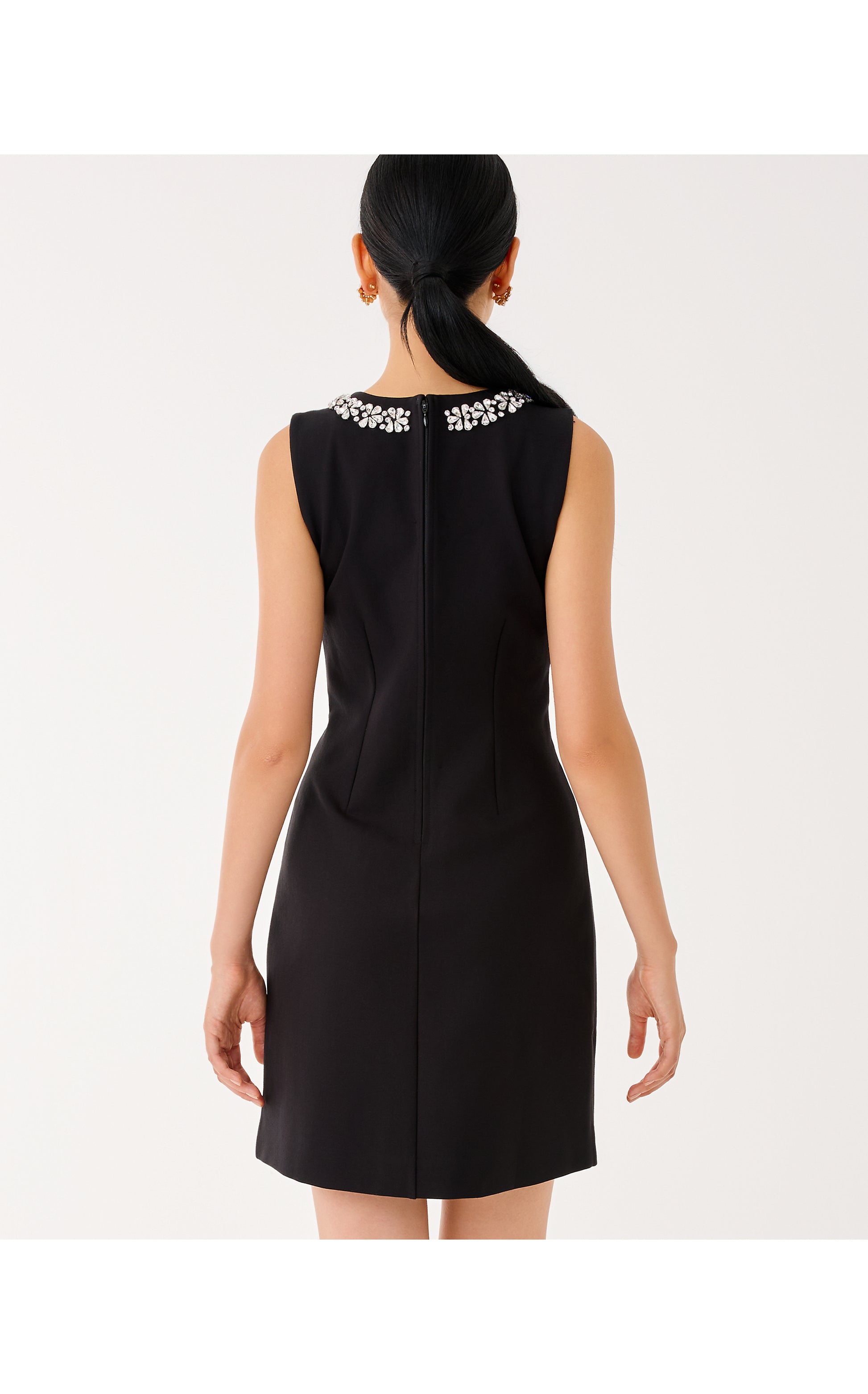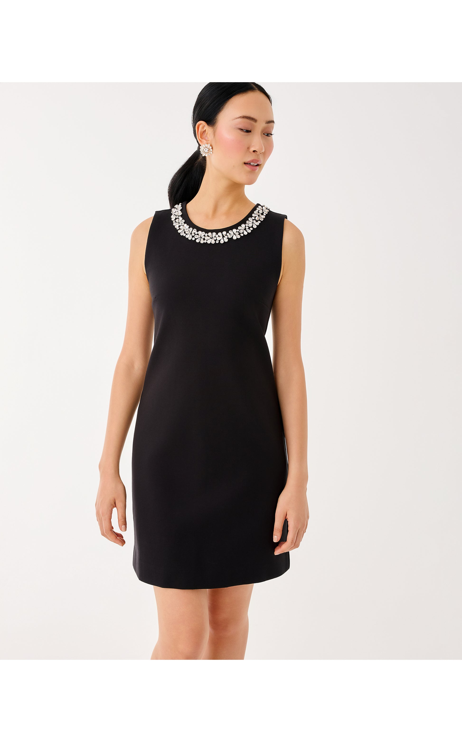 - Fitted shift dress with a rhinestone trim at the front and back neckline.