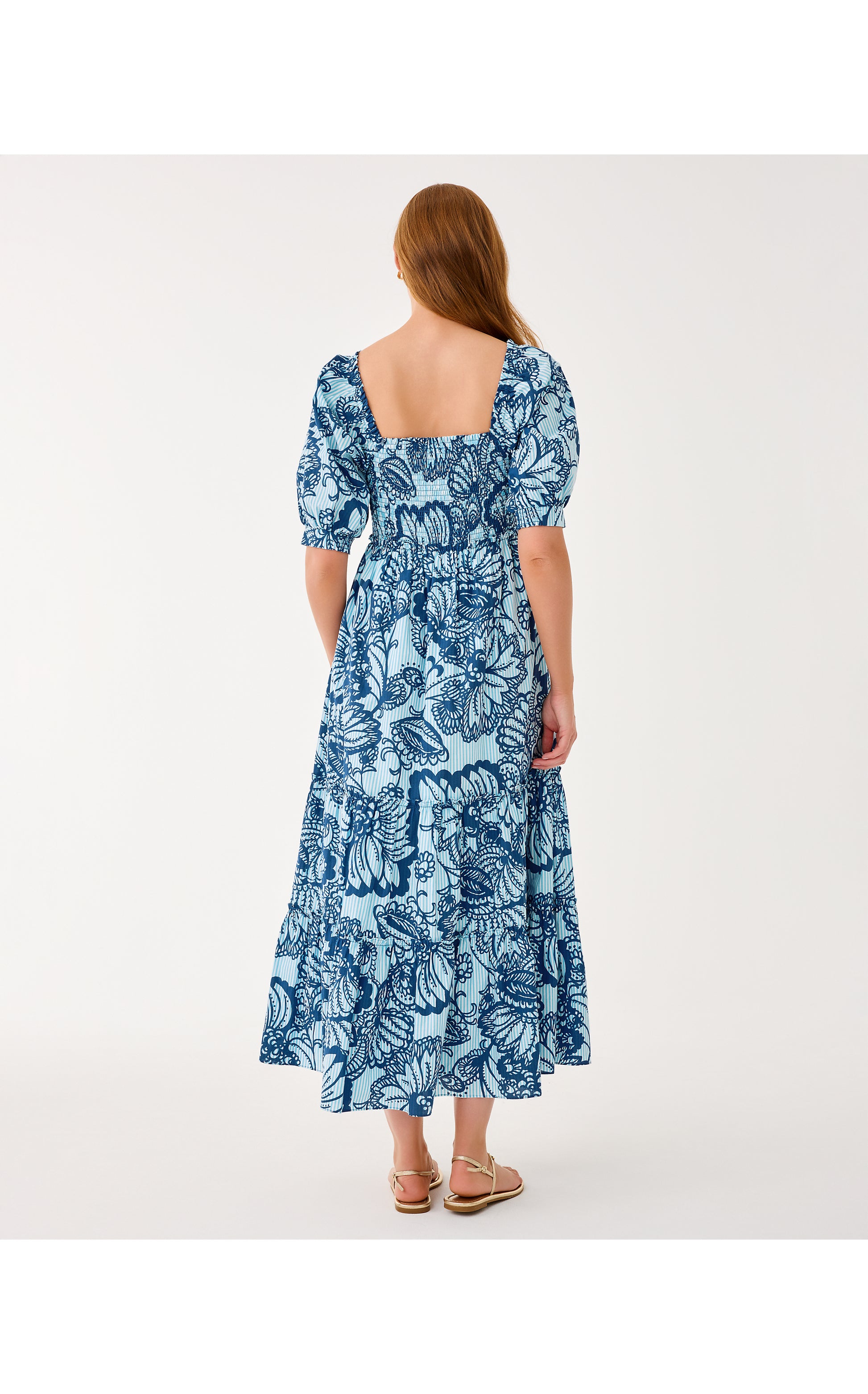 - Fit-and-flare, short sleeve maxi dress with a smocked bodice, tiered skirt, and side seam pockets.
