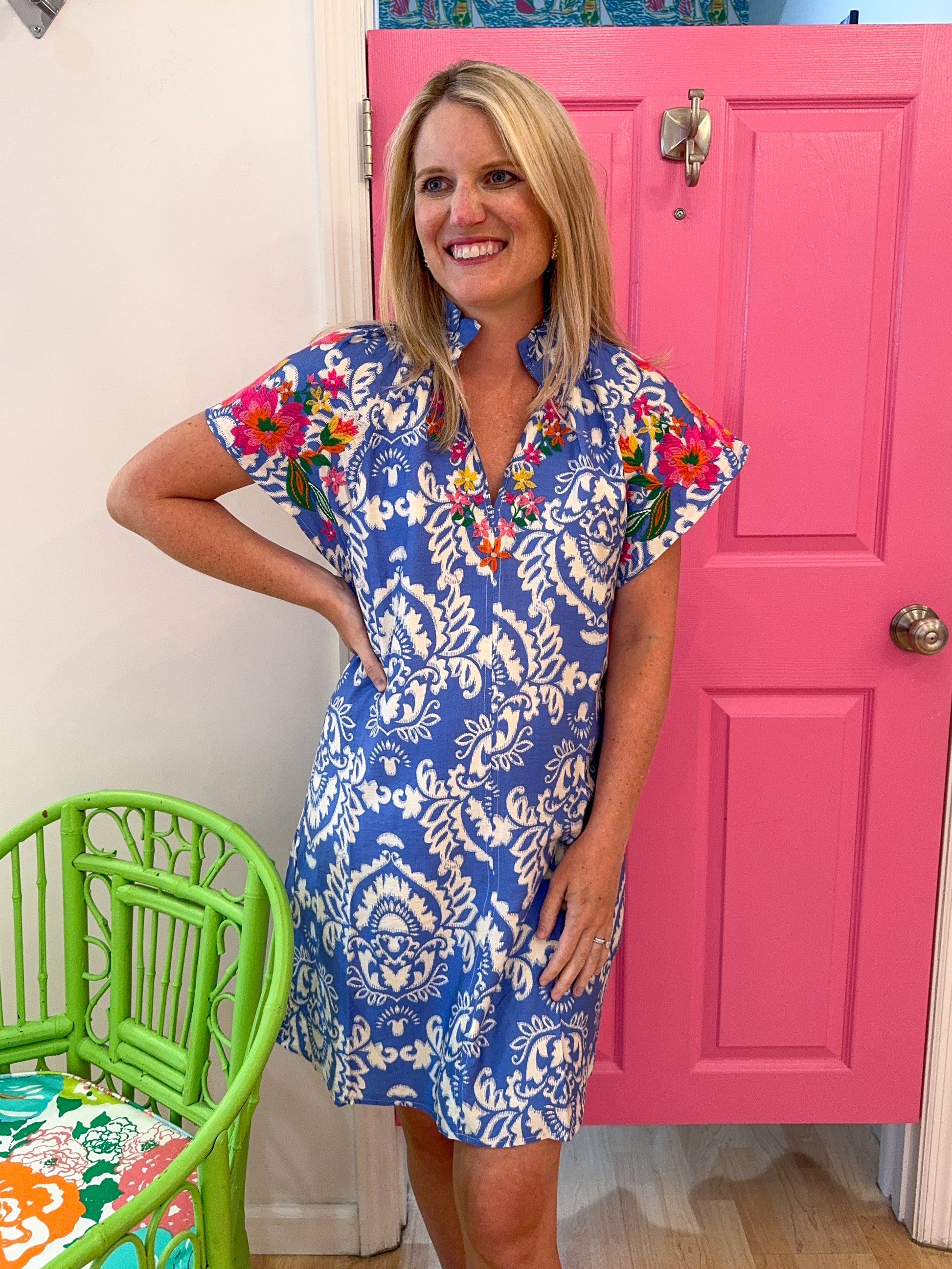 Chic, comfortable, and effortlessly elegant—our Heather Embroidered Short Sleeve Dress is your new summer staple. Crafted from a lightweight rayon-nylon blend, this dress features a timeless blue and white print that brings a touch of coastal charm to your closet. The standout detail? Beautifully embroidered sleeves in vivid floral hues that add a playful pop of color and artisanal flair.