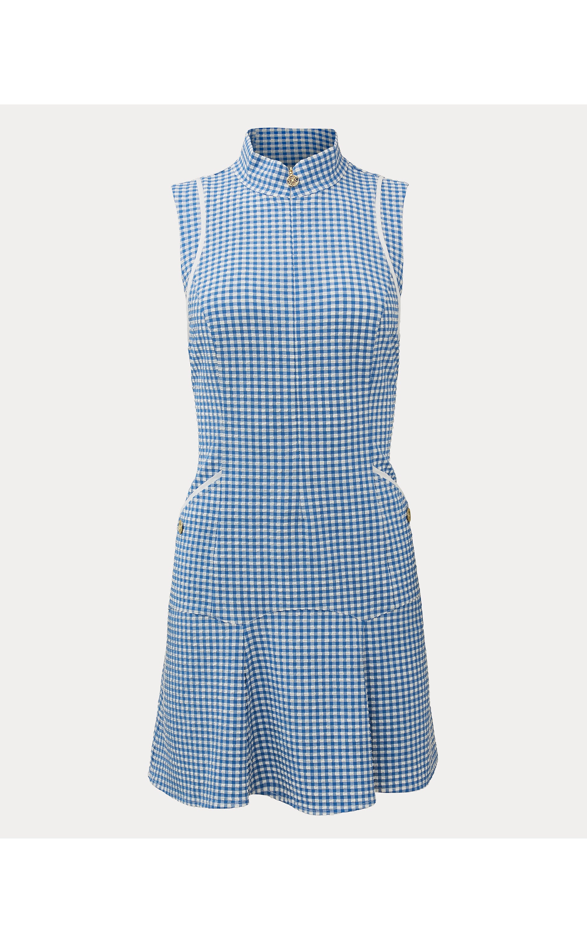- UPF 50+ Luxletic® zip-front golf dress with gold buttons, front pockets, and separate jersey undershorts with a pocket.