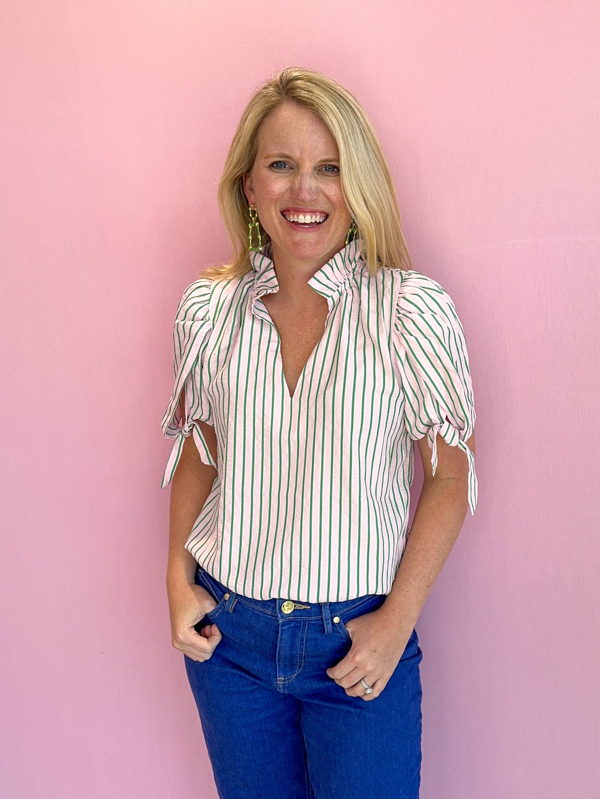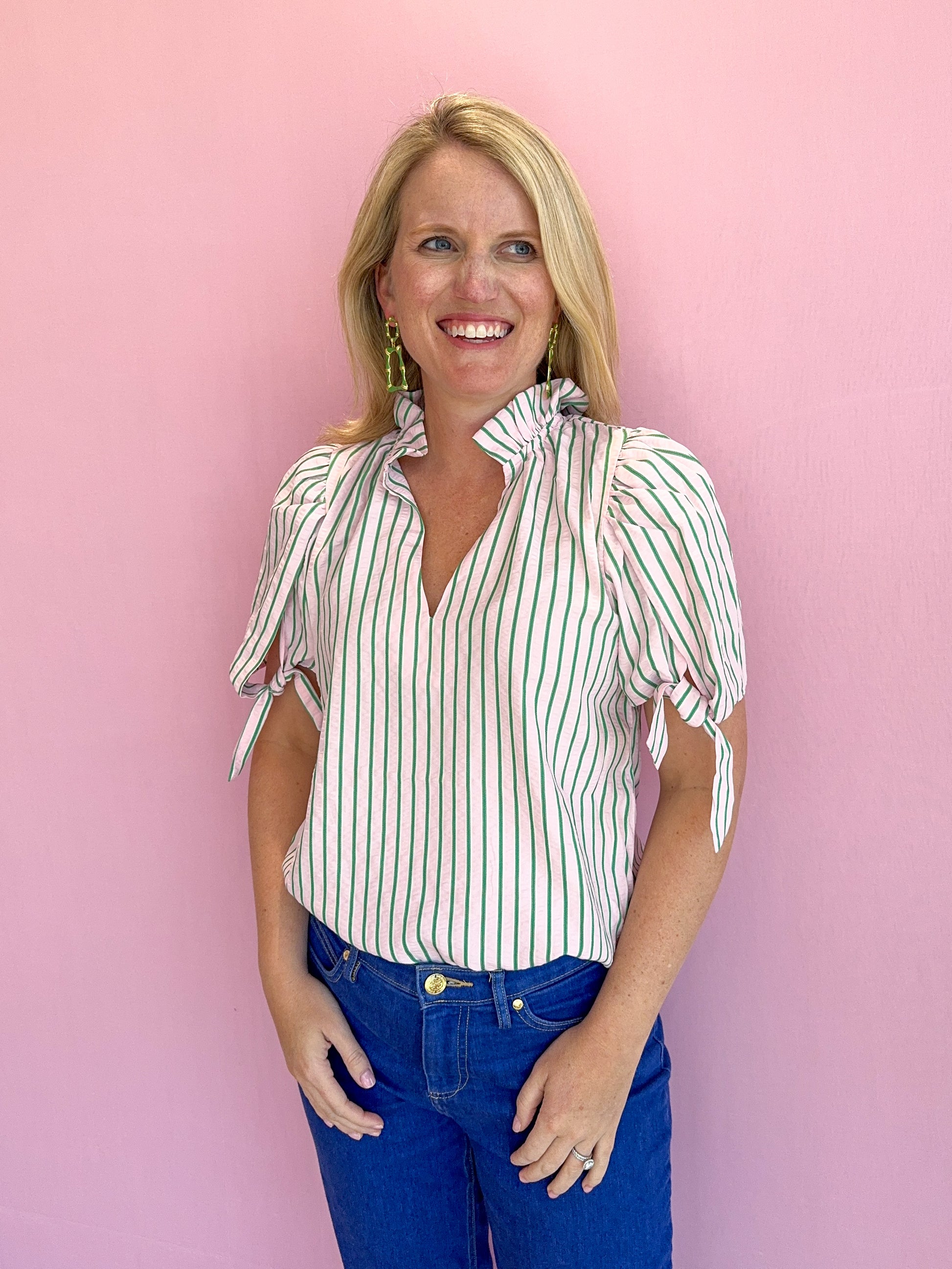 Brighten your wardrobe with the Linds Pink & Green Striped Top, a vibrant wardrobe essential from THML at Pink Palm Tampa. Featuring bold pink and green stripes for a fresh, resort-ready look, this breezy top is ideal for summer brunches, beach days, or everyday chic styling. Crafted from soft and breathable 100% cotton for all-day comfort, it pairs effortlessly with denim shorts, white pants, or skirts. Perfect for those who love playful patterns and classic comfort in one eye-catching piece.