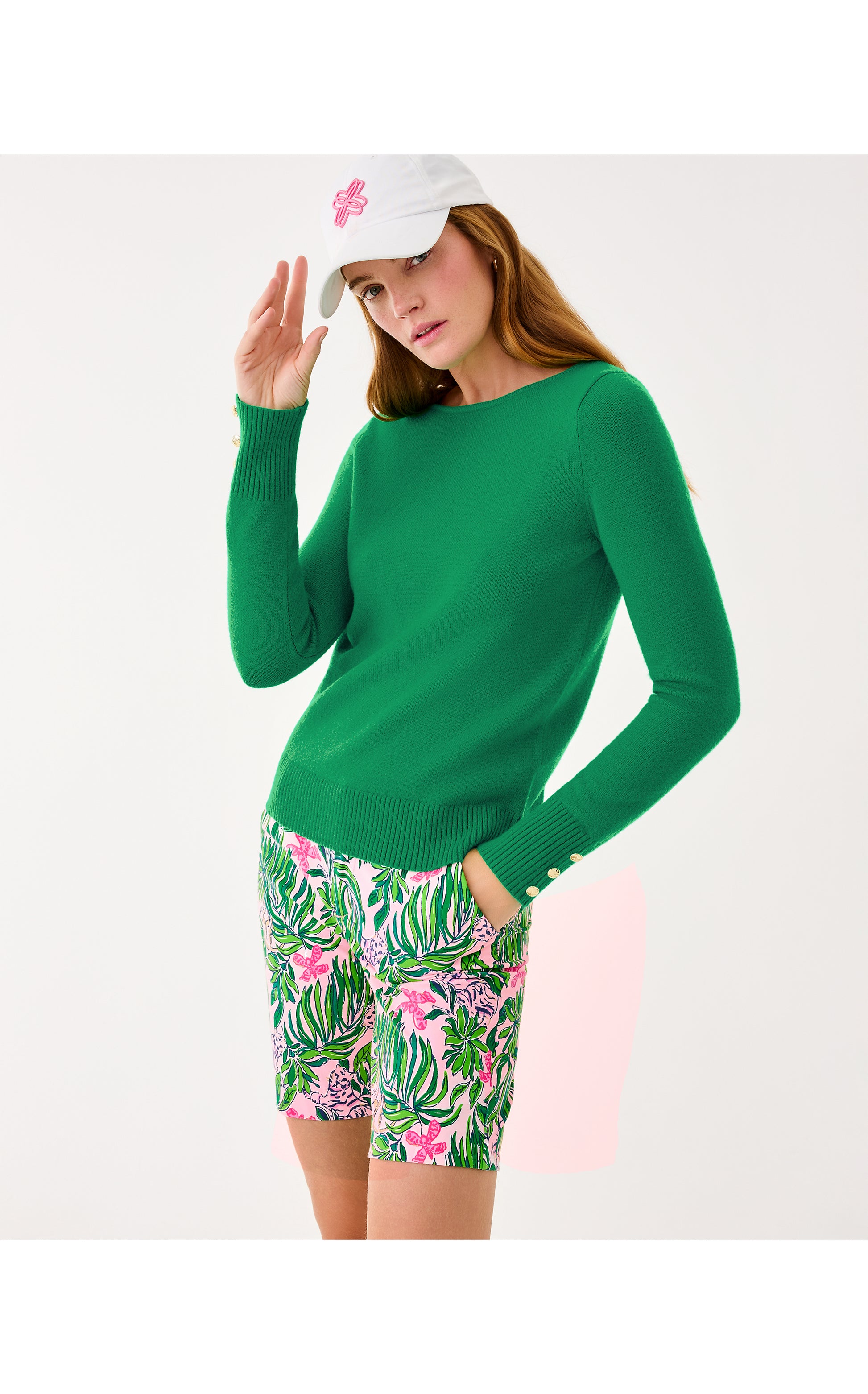 - Straight fit, long sleeve, boatneck sweater with buttons at each cuff.