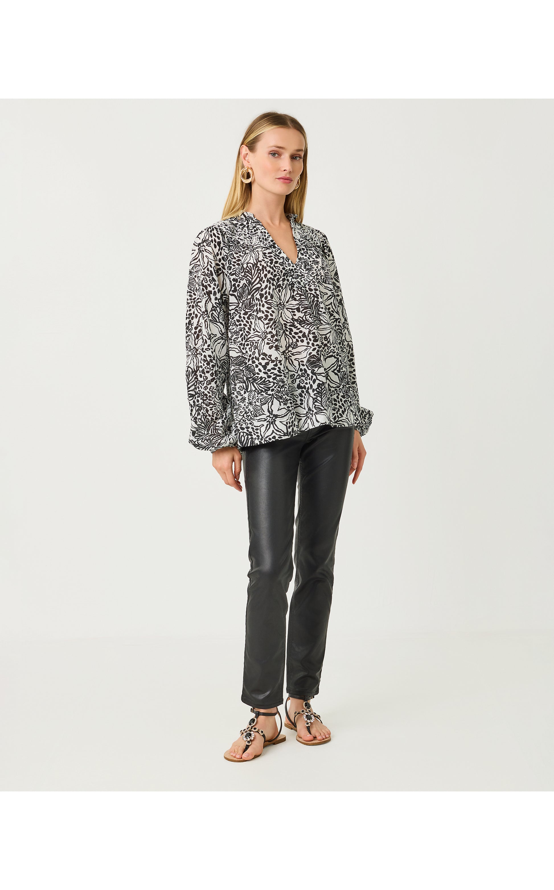 - Easy fit top with a ruffle collar, 3/4 length sleeves with elastic cuffs, and hand smocking detail at the neckline.