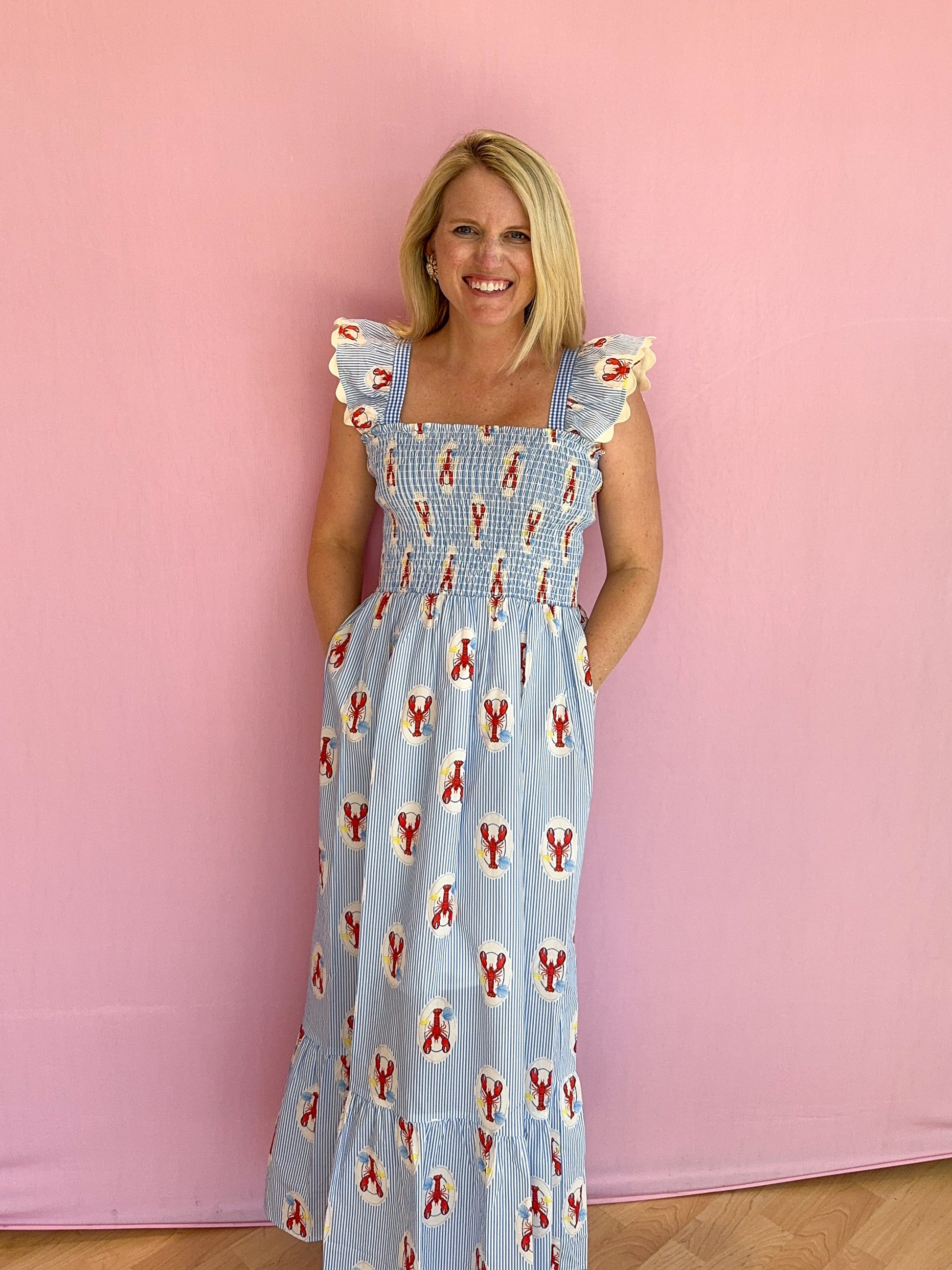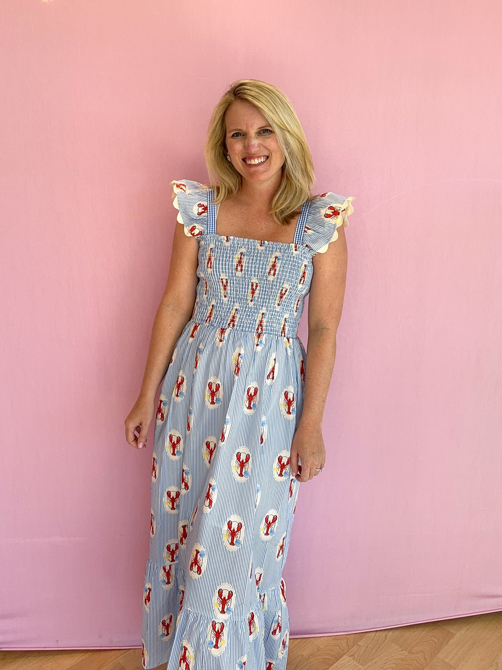 Make a statement in the Maine Lobster Print Smocked Dress, featuring a playful lobster print and a comfortable smocked bodice that flatters your shape. Perfect for seaside outings or warm-weather days, this dress adds fun and flair to your wardrobe.