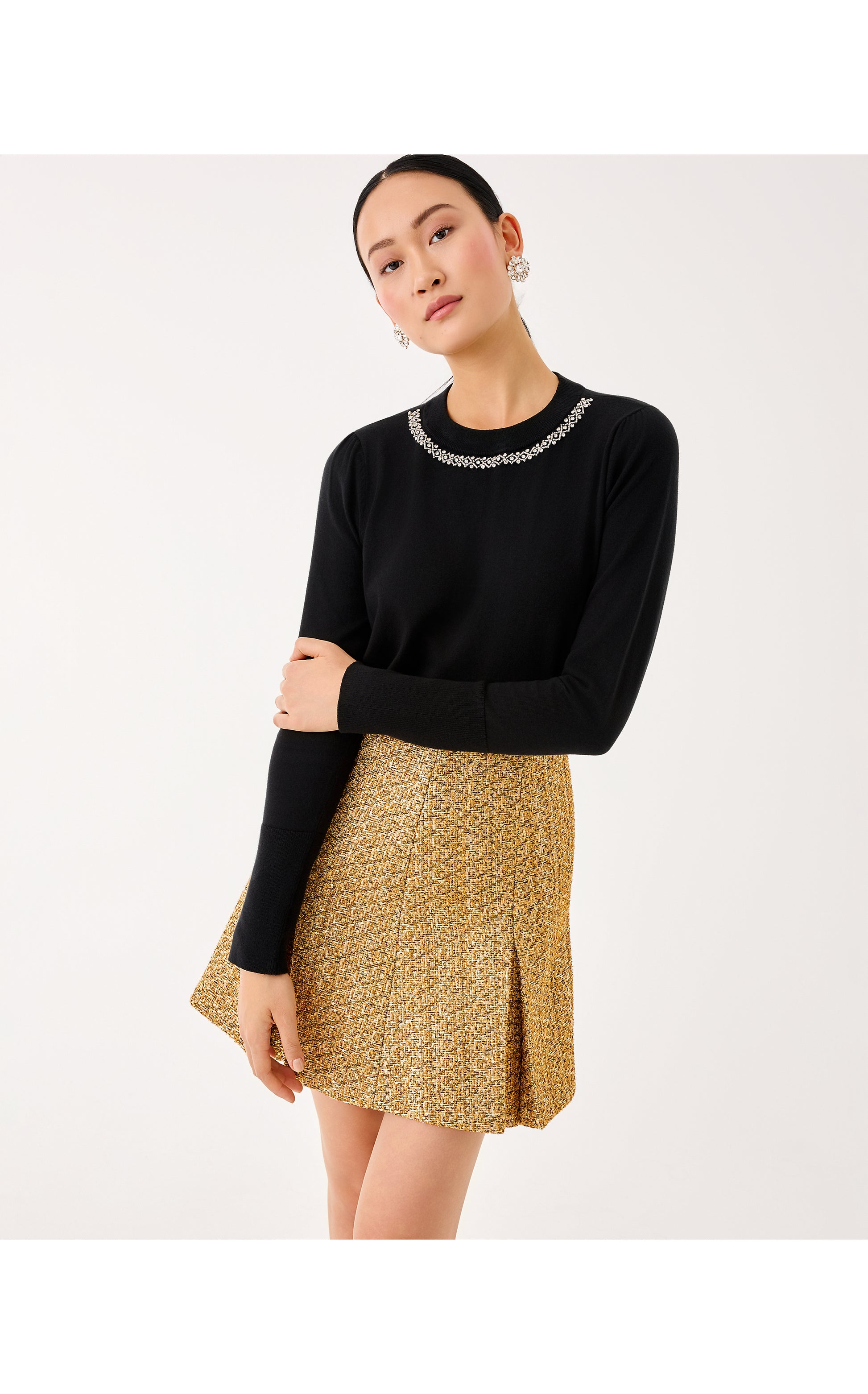 - Straight fit, long sleeve, crew neck sweater with a pearl trim.
