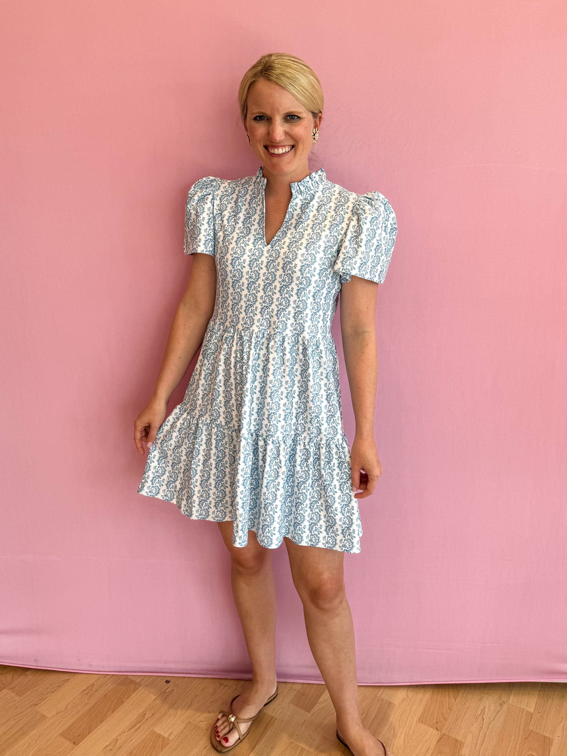 Meet the Navy Dress. Crafted from our S&Q Stretch fabric, the Navy features a ruffle-trimmed neckline, puff sleeves, and a flowing tiered skirt for effortless style.