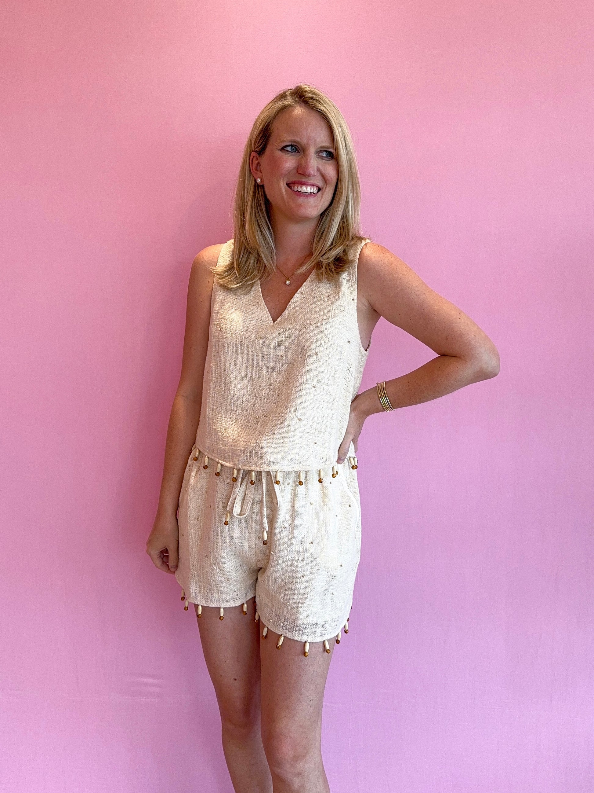 The perfect easy, breezy top for the summer! Pair the top with the matching Natatlie Wood Bead Shorts or a pair of white jeans to complete the look.