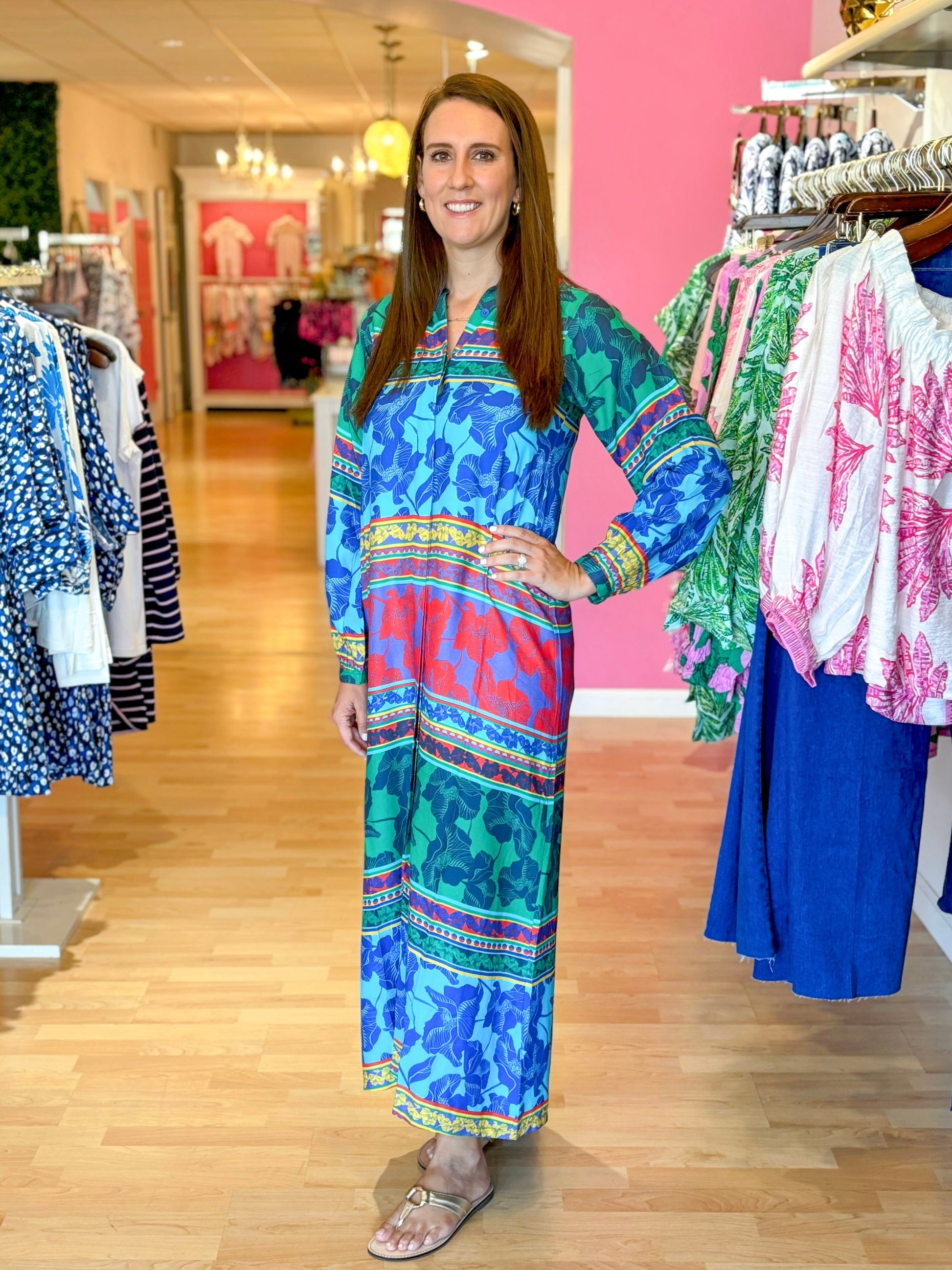 Make a bold statement with the Sienne Midi Dress, a stunning mix of vibrant colors and artful prints. Designed with a relaxed button-front silhouette and collared neckline, this dress flows effortlessly with every step. Long blouson sleeves add a touch of sophistication, while the tiered colorblocking of emerald green, sapphire blue, and ruby red brings a playful, worldly charm.